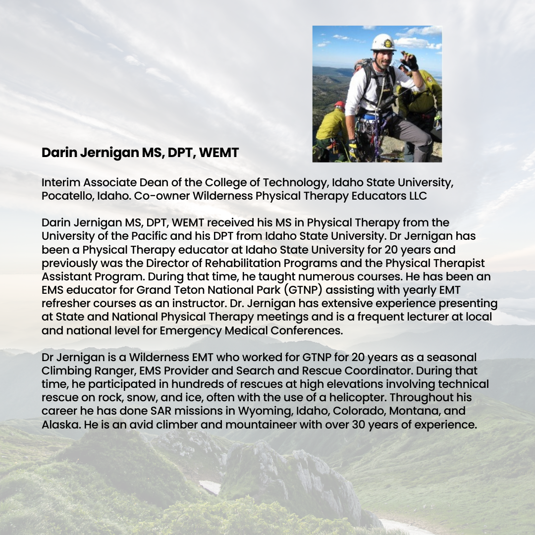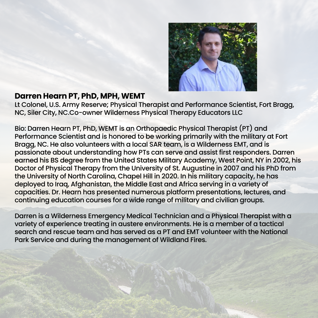 This 2-hour presentation will engage participants in the unique aspects of problem-solving and clinical reasoning needed to perform physical therapy and first aid care in adverse environmental conditions. The presentation will be based upon the speakers’ experiences providing point-of-contact backcountry patient care as Physical Therapists in the U.S. National Park Service, Wilderness Search and Rescue, and Wildland Fire Fighting.