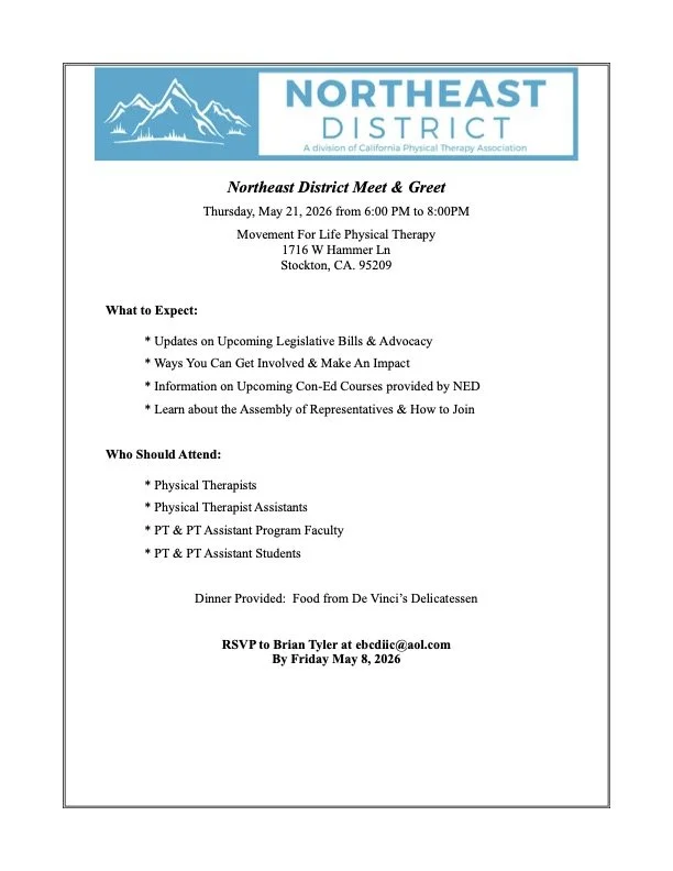 Northeast District Meet & Greet Thursday, May 21, 2026 6:00 PM 8:00 PM 18:00 20:00 Movement For Life Physical Therapy 1716 W Hammer Ln Stockton, CA 95209 (map) Google Calendar ICS